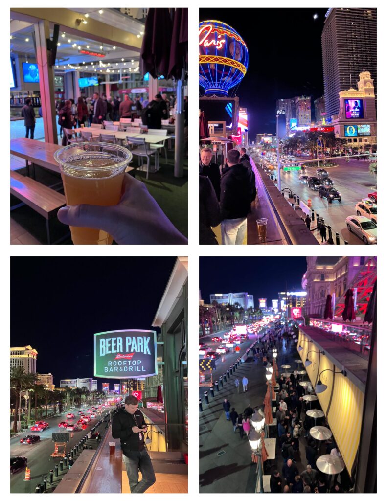 我是在逛街的路上,在Bellagio對面,發現這間Beer Park Rooftop也被包下,雖然這間沒有在官網的名單上,我也沒事先登記,他們還是讓我現場登記後就進去了。看起來大家好像都是成群結隊的到這邊聊天,但也有像我旁邊這位老兄是隻身一人前往的。
