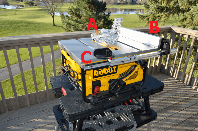 B 側邊固定器 (Rip Fence): 切長邊的時候用這個固定。
