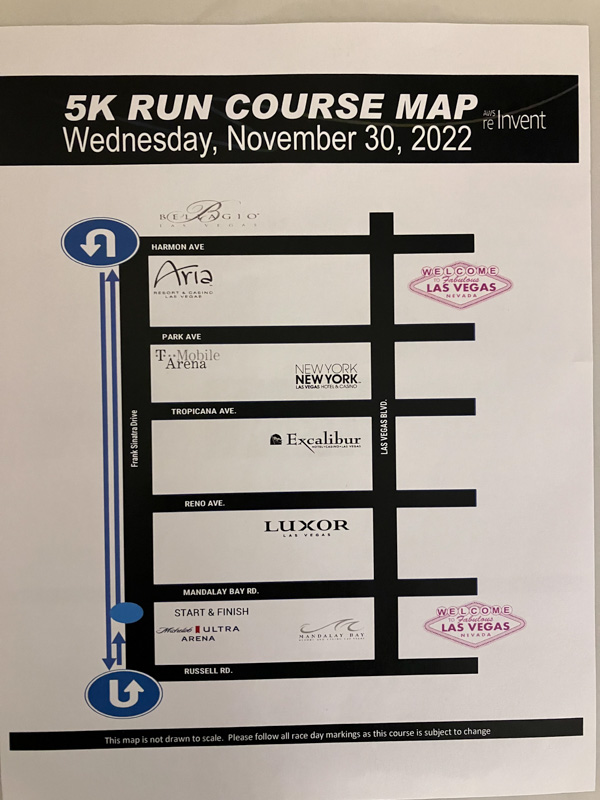 AWS re:Invent 5K是在MB的Michelob Ultra Arena集合,6:30AM開跑。路線很簡單,就是沿著大街平行的Frank Sinatra Dr.,跑到Bellagio後直線折返。