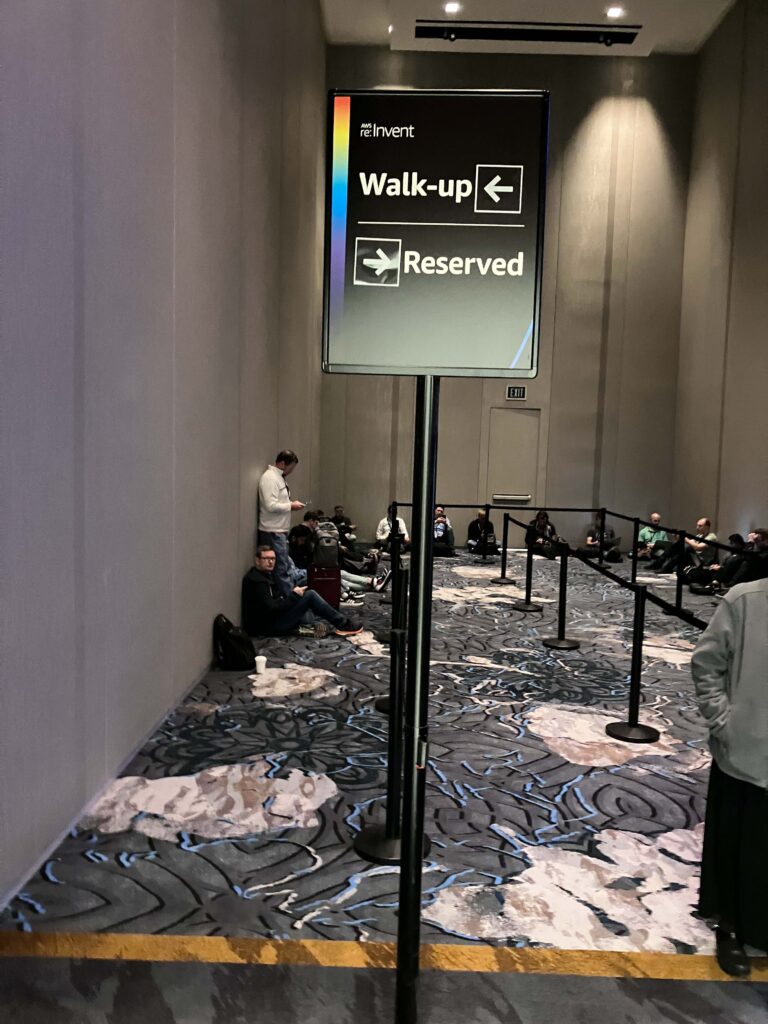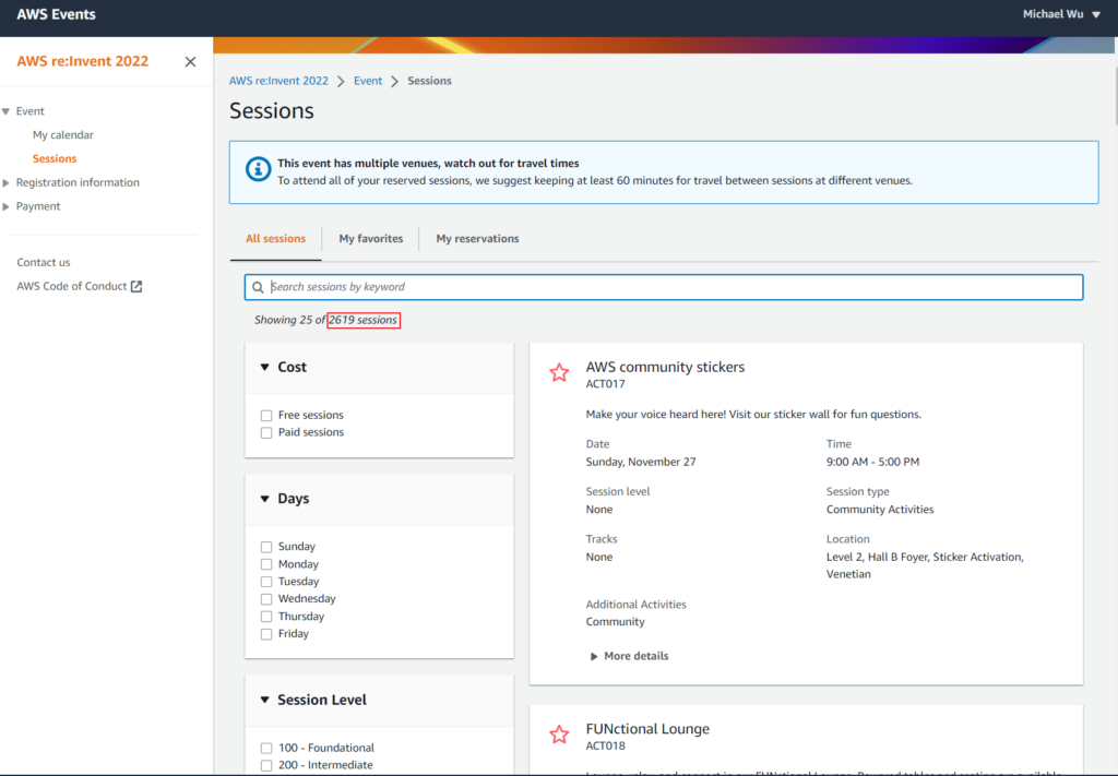 線上報名後,就可以登入re:Invnet的網站查看Sessions。每個Session提供大約10-20%的預約座位,10月份左右,就可以開始線上預約你有興趣的sessions。有線上預約的人必須在session開始前10分鐘到場,如果沒到,就會開放給現場排隊的人。雖然re:Invent的sessions相當多,有2千多個! 但就像大學選課一樣,熱門的課程很快就額滿了。