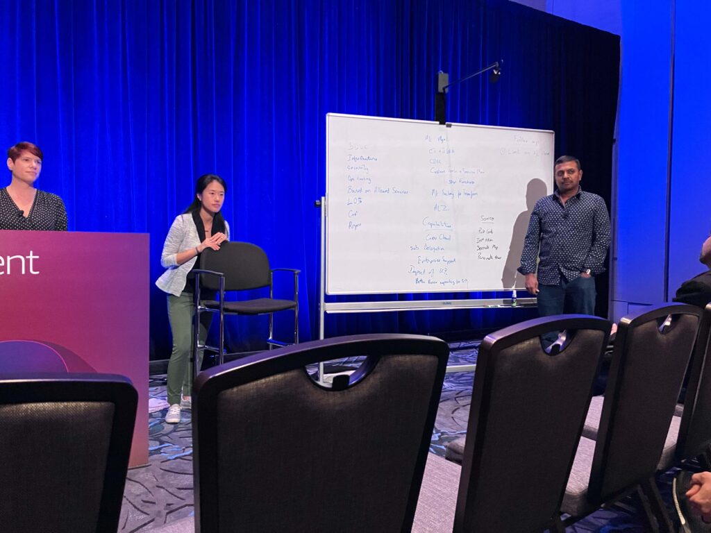 Chalk Talk跟Breakout Session有很大的差別,Breakout session像是演講,大多數的時間是講者在說話,最後才有幾分鐘的Q&A。Chalk Talk會有幾個主題,讓講者跟觀眾互動,並在白板上討論。這邊可以學到很多別人的ideas,我覺得比Breakout session還受用,但位置不多,所以最好要事先預約或是早早去排隊。