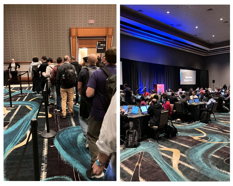 提早一個小時到會場已經有人在排隊,因為這是workshop,需要帶筆電實際操作 ,可以參與的人數會比較少,只有98個位置,但大約有150人在排隊! 我們被告知如果預約的人都來報到,我前面的第5個人就是最後一個位置。但要等到開場前10分鐘,才能知道是否能進去,所以只能祈禱可以排到我。為了安全起見,我先用APP看看附近別的課程,找到一個在MB的Breakout session,如果這邊沒上,就去那邊吧…幸好最後有排進去,看來有不少預約的人沒來。