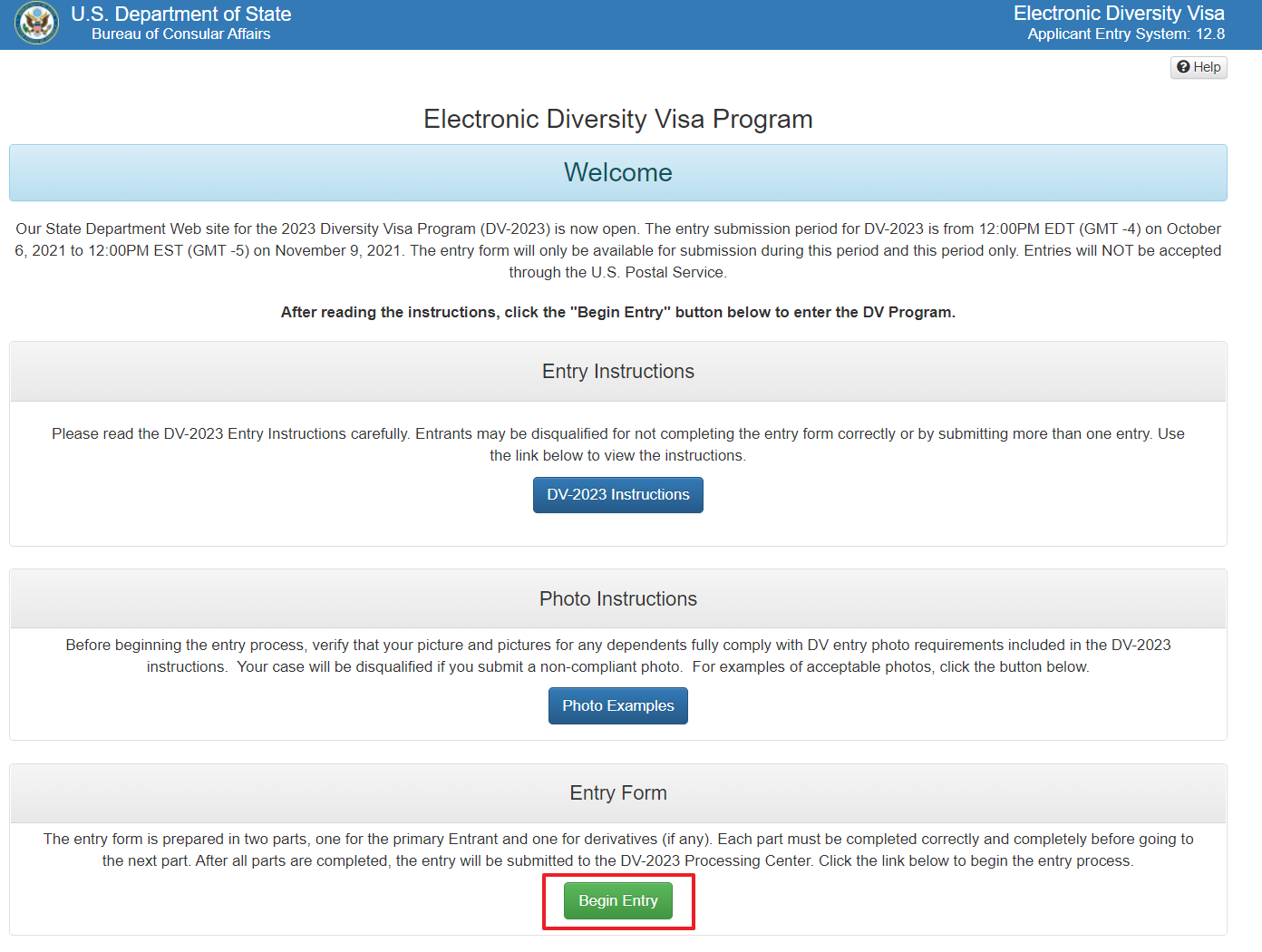 進入申請頁面後,點選 Begin Entry 的綠色按鈕開始申請。(開放申請期間才會有開始申請的按鈕)
