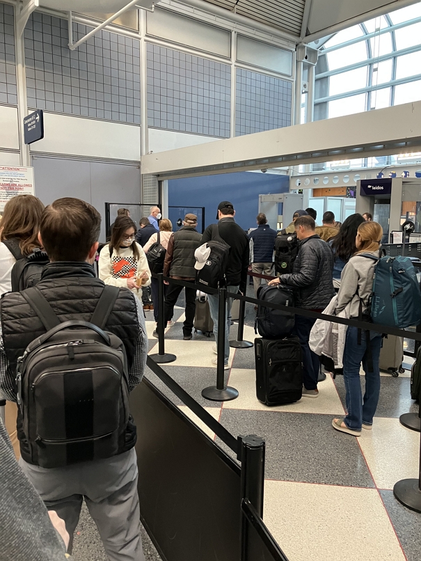 從台灣飛芝加哥在舊金山轉機,行李需要拉出來重掛,然後還要再過一次行李檢查。當我掛完行李,走到行李檢查站時,看到一圈又一圈的人龍…不誇張! 目測大約有200多人! 跟著排隊大概要40分鐘以上。