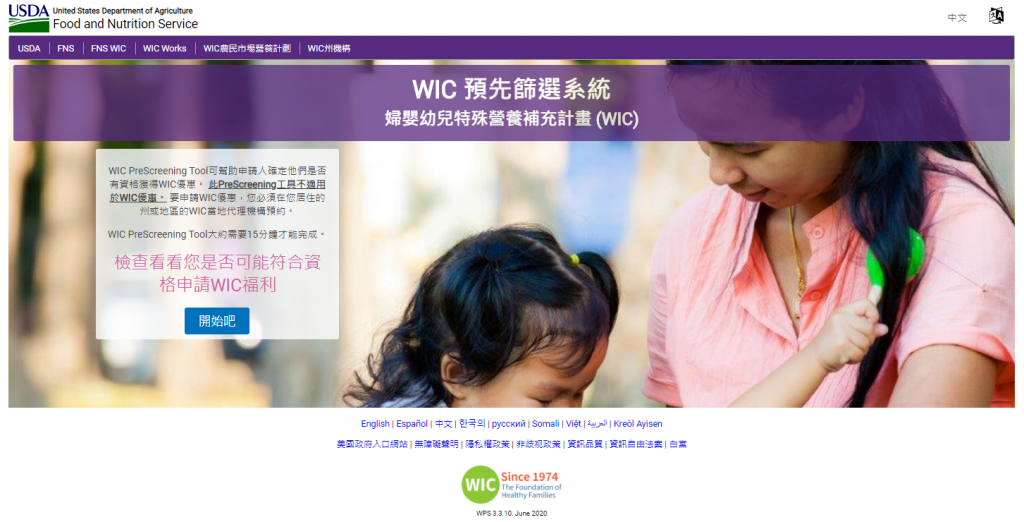 首先到WIC的官方網站,這個頁面是WIC Prescreening Tool預先篩選工具,可以切換成中文,點選底下的”開始”按鈕。